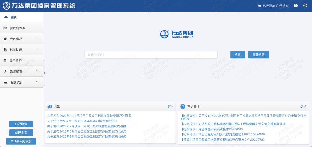 大連萬達集團股份有限公司(以下簡稱萬達集團),創立于1988年,經過30余年發展,集團旗下子公司遍及全國,集團業務涵蓋商業、文化、投資等,涉及行業從傳統的地產到商業管理、酒店管理、影院、體育、兒童娛樂等多種業態,其涉及檔案從形式到內容都差異巨大。隨著萬達集團業務規模和數據規模的快速增長,集團管理模式也在不斷變化,其對檔案的管理和利用效率也提出了更高的要求。為此,自2018年起,同方鼎欣運用現代化綜合檔案管理系統和行業創新技術方案,為萬達集團量身打造了以數字資源為基礎、安全管理為保障、遠程利用為目標的數字檔案管理系統,實現了檔案管理由傳統到現代、由封閉到開放的重要轉變,全面提升了萬達集團的客戶檔案管理水平和檔案、資料的利用效率。