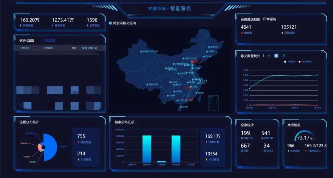 集團的“檔案管理智能看板”是對全集團檔案數據的高度集成,不僅能實時統計全集團檔案總量、借閱總量、移交總量、庫房總量及其分布情況,監督其他業務系統推送檔案數據情況,還可以有效防控檔案數據安全,對“拖延歸檔、超期借閱、異常下載、蓄意刪除”等行為進行監控。