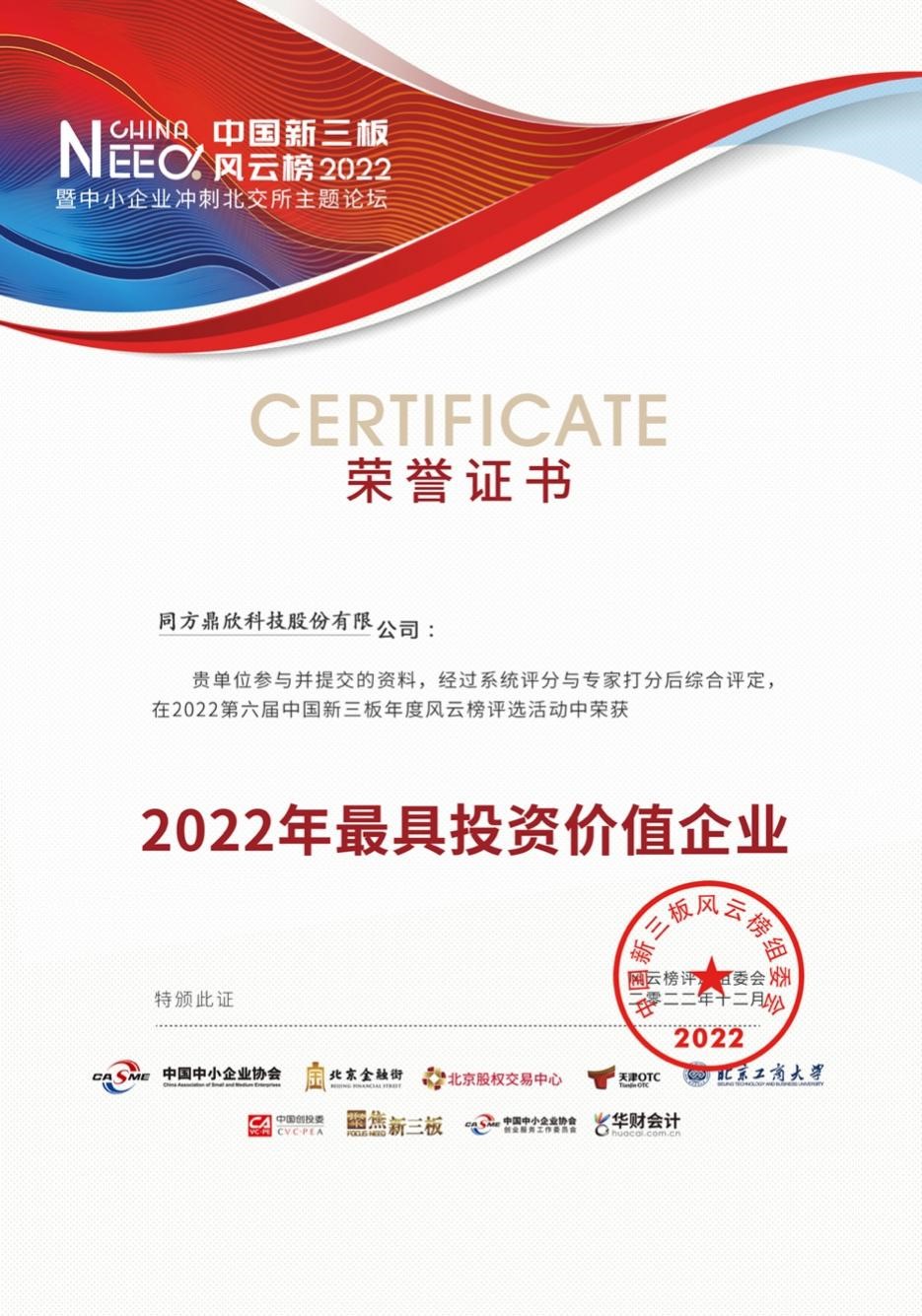 公司始終堅持誠信為本、持續創新,在打造核心競爭力過程中長期堅持發揚自主創新的精神,在開拓市場過程中始終實踐以客戶價值為核心的服務理念,以滿足客戶需求為己任,積極探索產業變革與業務增長模式、緊抓發展機遇與未來方向的戰略部署能力。此次公司成功獲得新三板年度風云榜“2022年最具投資價值企業”、“新三板優秀企業家”、“新三板優秀企業金牌董秘”三大獎項,正是憑借著公司多年來持續增長的經營規模、多年積淀的服務能力、研發能力和行業影響力。