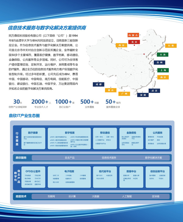 成立于1994年的同方鼎欣深耕信息產業領域近30年,是我國推進行業數字化轉型的先行者之一,公司秉承“科技創新、服務社會”的宗旨,致力于成為中國領先的信息技術服務與數字化解決方案提供商。公司總部位于北京,業務輻射全國,覆蓋全國50多個主要城市,并在日本東京設有全資子公司。現已成為覆蓋醫療健康、數字檔案、移動通信、金融保險、公共服務等眾多領域的解決方案服務商。同時,公司可為全球客戶提供管理咨詢、定制開發、運行維護、系統集成等專業的IT服務,通過全方位的信息技術服務助力客戶實現數字化轉型和升級。經過多年的積累,公司先后成為IBM、惠普中國、中國移動、中國電信、南方電網、佳能醫療、中國銀行、建設銀行、中國石油、中國平安、萬達集團等國內外知名企業的數字化解決方案供應商。