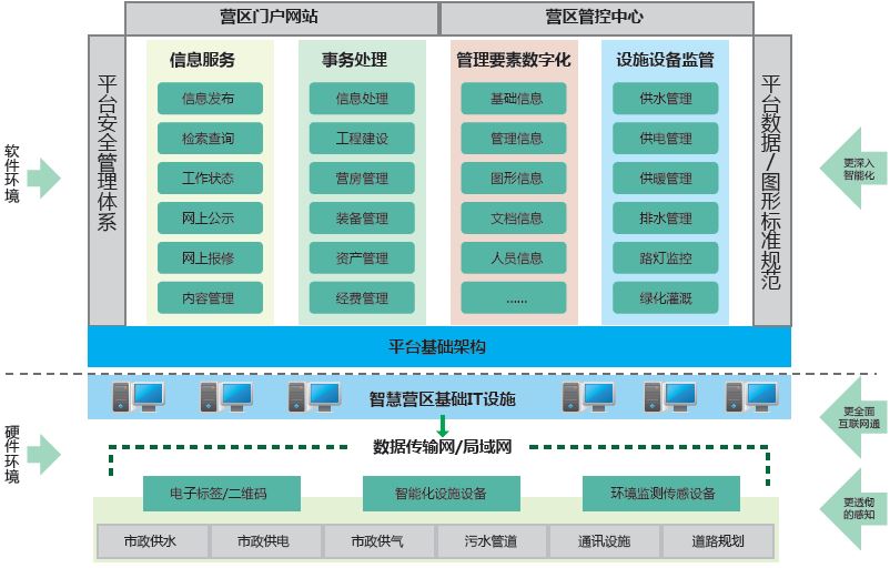 智慧營區精細化管理服務平臺是一套由軟件系統、專用物聯網、管控中心、數據采集及控制設備、信號傳輸線路、終端監控設備(傳感器和執行器)等組成的,實現了營區資產管理、營房部門的事務管理、營區設施的智能控制的一套整體解決方案。該平臺的應用可以實現營區管理從事后管理轉變為源頭管理;從突擊管理轉變為長效管理;從專業部門管理轉變為綜合管理;從人力手工管理轉變為依托現代科技;從粗放經驗型轉變為精細科學化;從評價主觀轉變為評價客觀。