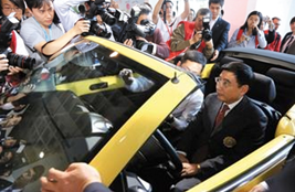 ↑工業と情報化部部長の苗圩が車インタネット改造車に乗って車インタネットスマーサービスを體験します