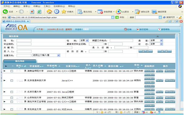 要員の選定については、同方鼎欣には厳格な面接フローがあります。その中にはCV絞込み、電話面接、筆記試験、外國語試験、面接などがあります。面接結(jié)果を「面接記録表」に記録して、人材庫に登録します。次の畫面をご參照ください。