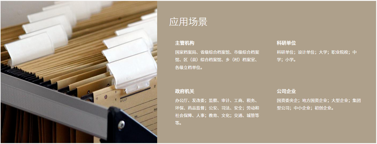 公司深耕檔案信息化領(lǐng)域,構(gòu)建安全、自主、可控產(chǎn)品,依托國(guó)產(chǎn)化生態(tài)環(huán)境推動(dòng)人工智能、區(qū)塊鏈、大數(shù)據(jù)和云計(jì)算等技術(shù)的創(chuàng)新運(yùn)用,為各省市檔案局館、高校、科研院所、政府機(jī)關(guān)、企業(yè)集團(tuán)等提供檔案咨詢及數(shù)字檔案館室/智慧檔案館/集成工程的建設(shè)與數(shù)據(jù)分析檢測(cè)、檔案SaaS平臺(tái)等全產(chǎn)業(yè)鏈檔案信息。